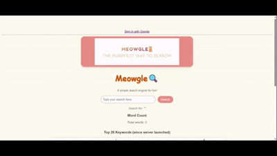 In this project, my team developed a playful yet functional search engine named Meowgle (“Meow” + “Google”), built with Python for both frontend and backend components. The system allows users to search any term on a web interface, automatically counting word occurrences and storing search history. With features like Google Account login, personalized history sync, and an anonymous browsing mode, Meowgle provides a smooth and engaging user experience while maintaining a clean and minimal web interface.